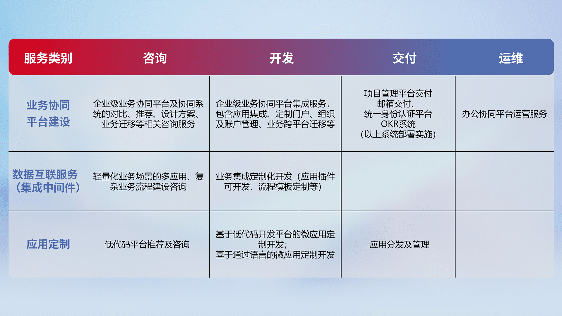 针对钉钉、、、企微、、IDaas等平台级产品提供产品的规划、、方案、、、、交付、、、、定制化开发等服务,,,,实现如统一协同办公、、智能客户服务、、、混合会议管理、、智能数据查询、、、、等业务场景,,,实现数字化转型。。。。