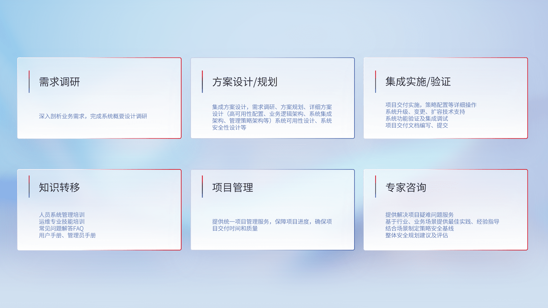 针对客户行业特性,,将宏观的安全战略和需求,,,通过专业的交付服务,,,,实现项目落地,,,为客户提供标准规范的集成交付服务。。。。